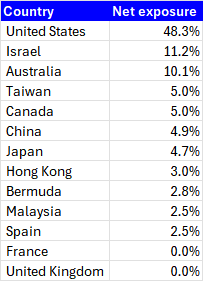 - USD cash holdings dominate the United States exposures. Some AUD cash holdings explain the Australian exposure. The other country exposures are from active satellite equity positions.