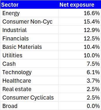 - The other exposures are weighted more toward defensives, hard assets and financials.