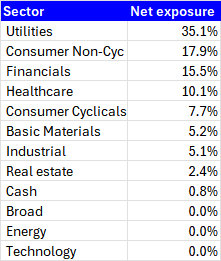 - Defensive sectors such as Utilities and Consumer Staples (Non-Cyclicals) make up the largest exposures. I cut my Energy exposure too soon as I got shaken out by the headlines.