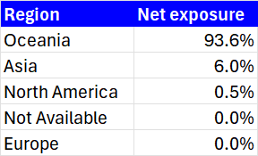 - The portfolio has most of its exposure to Oceania via AUD cash holdings