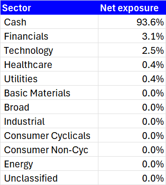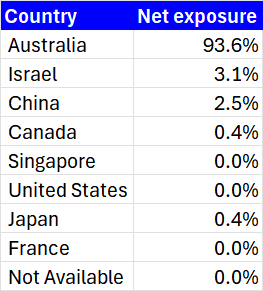 - Besides the cash holdings, there is some idiosyncratic exposure to Israeli financials and a Chinese AI technology player.