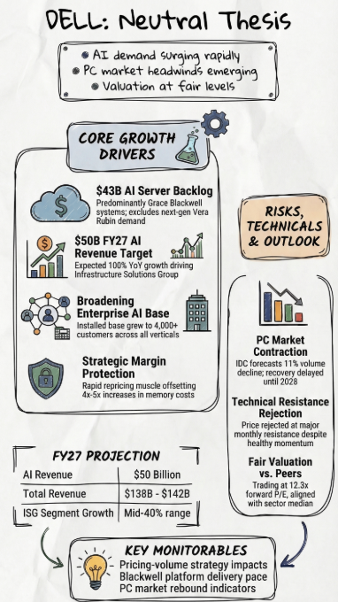 - AI revenue could reach $50 billion in FY27, driving strong Infrastructure Solutions Group growth, while Client Solutions faces muted growth from a shrinking PC market.