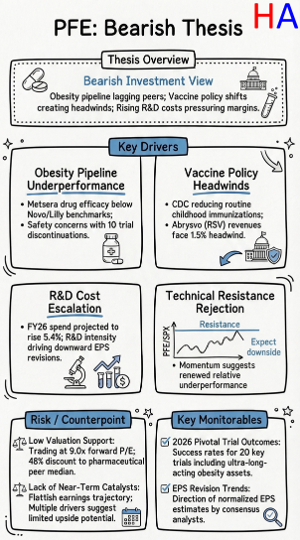 - PFE is ramping up pivotal trials in obesity and oncology, but rising R&D intensity is pressuring earnings and driving downward revisions to normalized EPS estimates.
