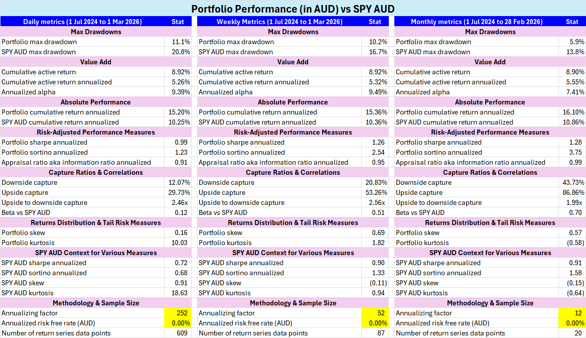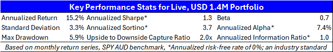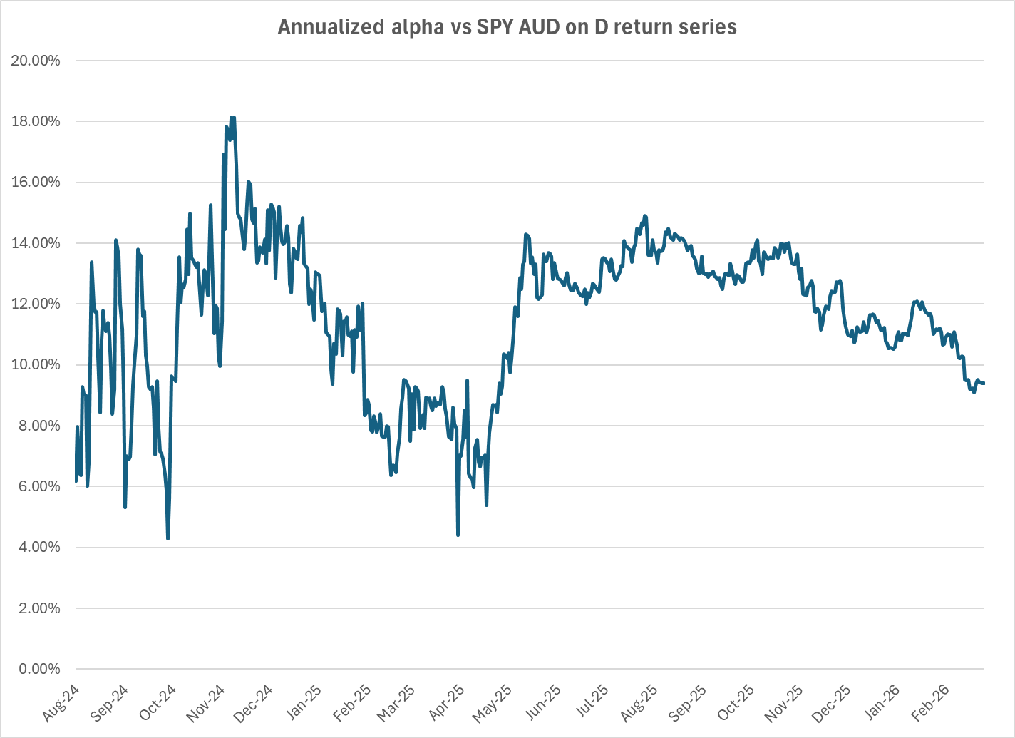 - Daily/weekly annualized alpha: of >9% vs SPY AUD benchmark.