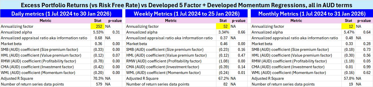 Portfolio vs Developed 5 Factor + Developed Momentum Factor Regressions