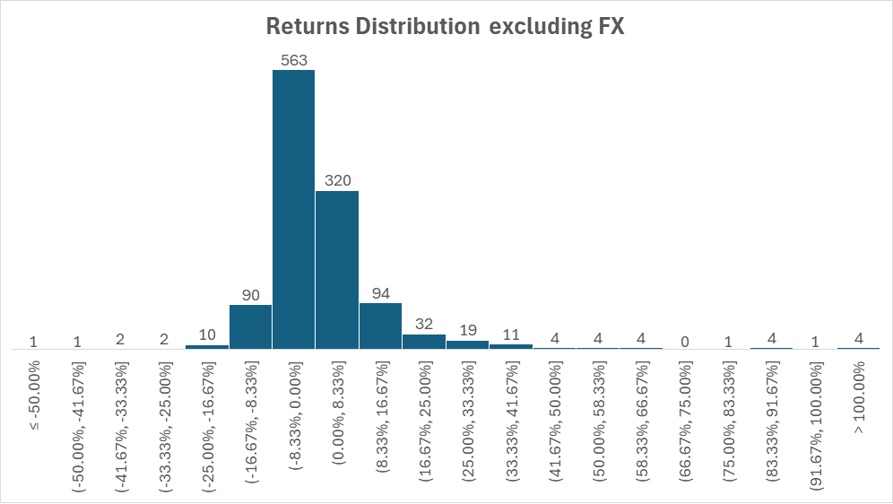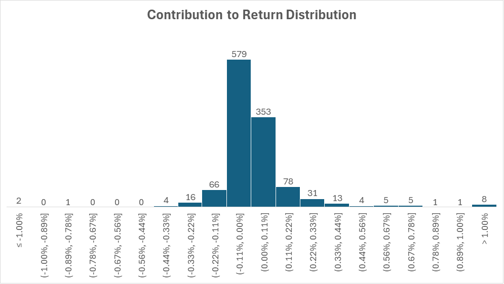 - Histograms show that return contributions have a clear positive skew and is comprised of the aggregate of many small bets rather than a small number of outsized winners.