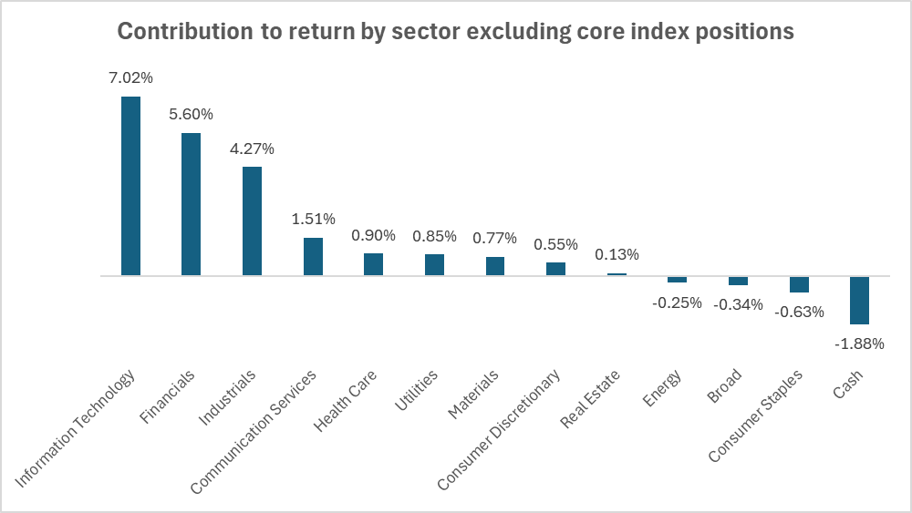 - Most of the CTR comes from active satellite picks, not core index exposure positions
