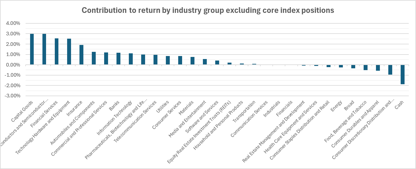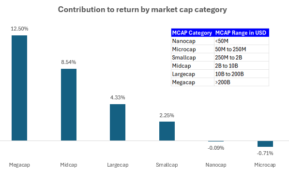 - Minimal return contributions from smallcaps, microcaps and nanocaps.