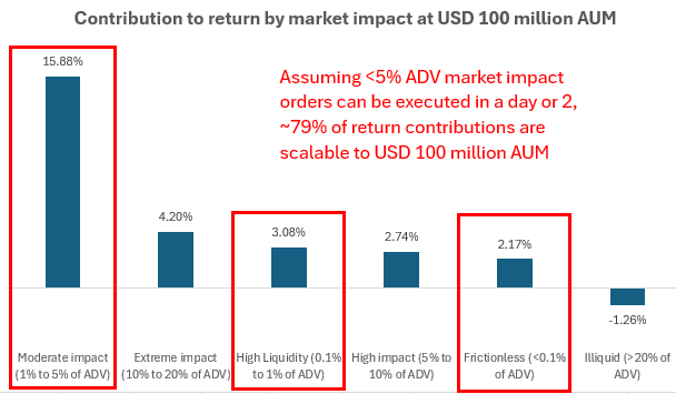 - Market impact analysis suggests this portfolio is largely scalable to >USD 100M AUM.