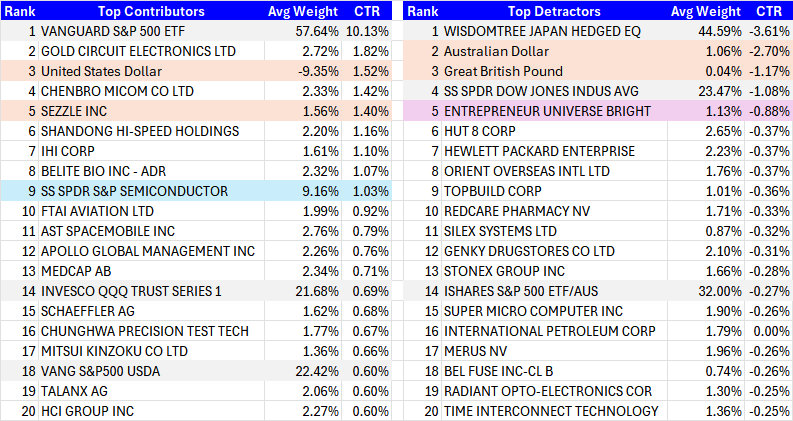 - Top contributors are meaningfully larger than top detractors, showing positive