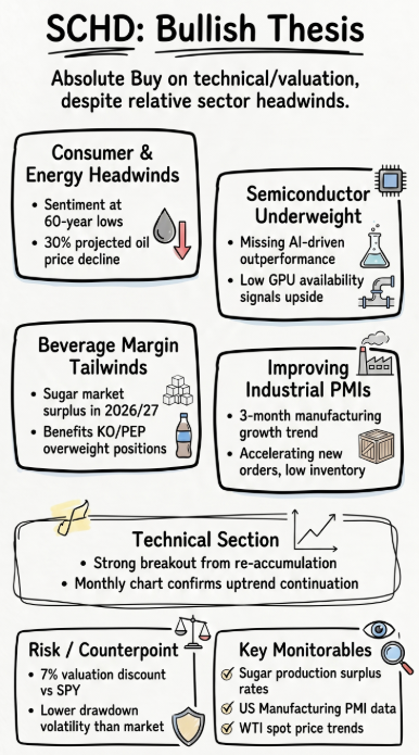 - Sugar market surpluses and improving manufacturing PMIs support SCHD’s overweights to beverages and industrials, providing medium‑term margin and growth tailwinds.